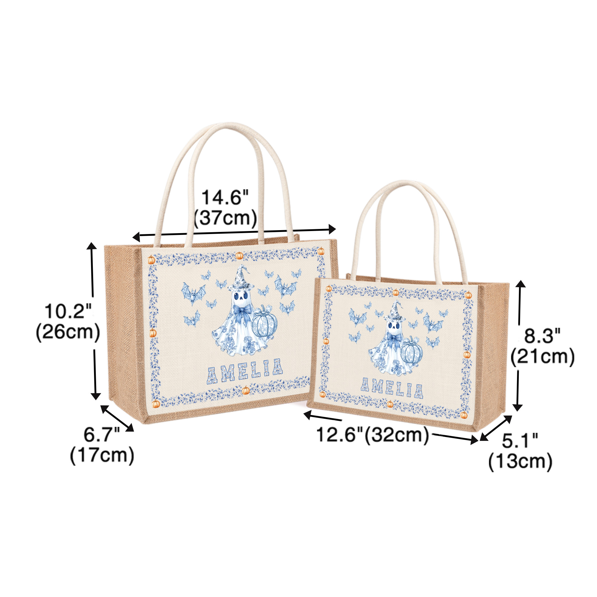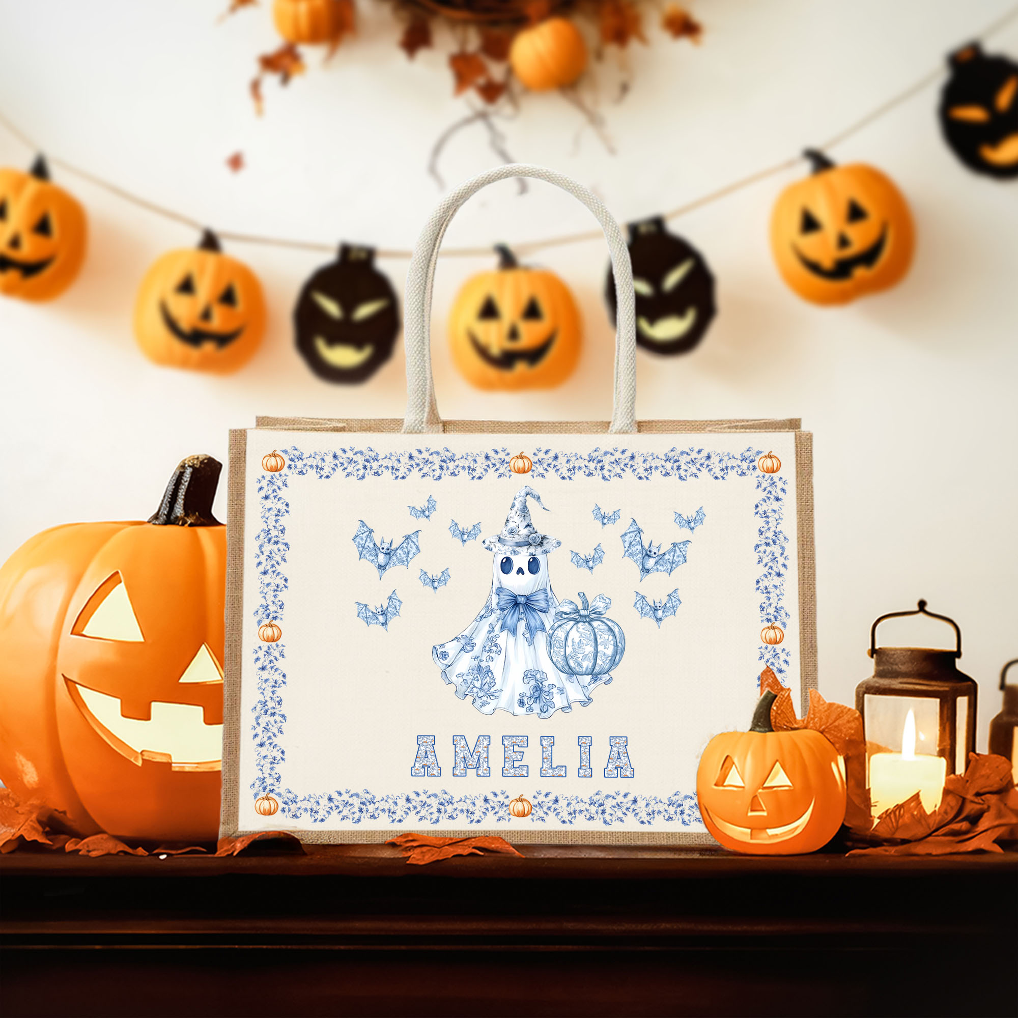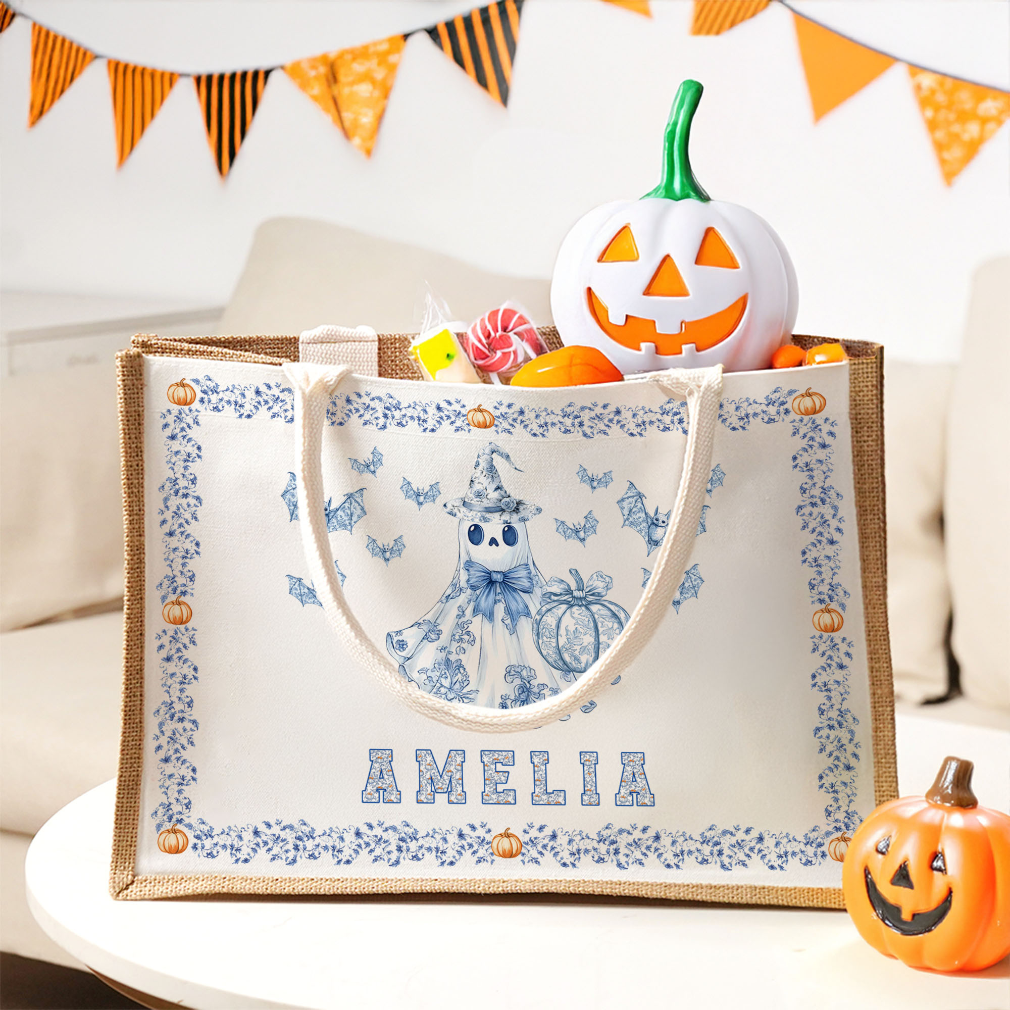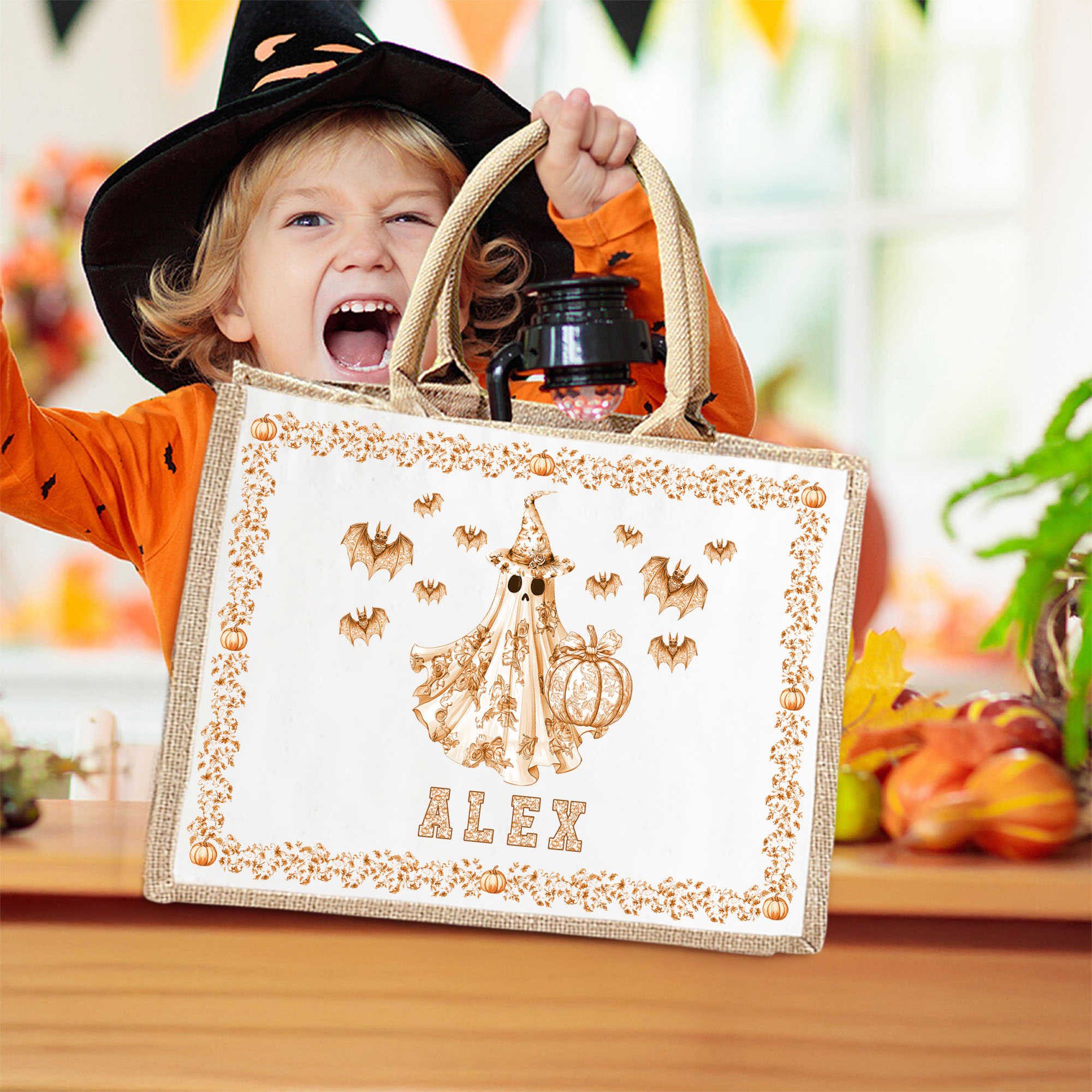 Personalized Halloween Jute Tote Bag with Name & Bat Pumpkin Ghost Design, Large Trick or Treat Storage Bag, Custom Halloween Gift for Kids/Women