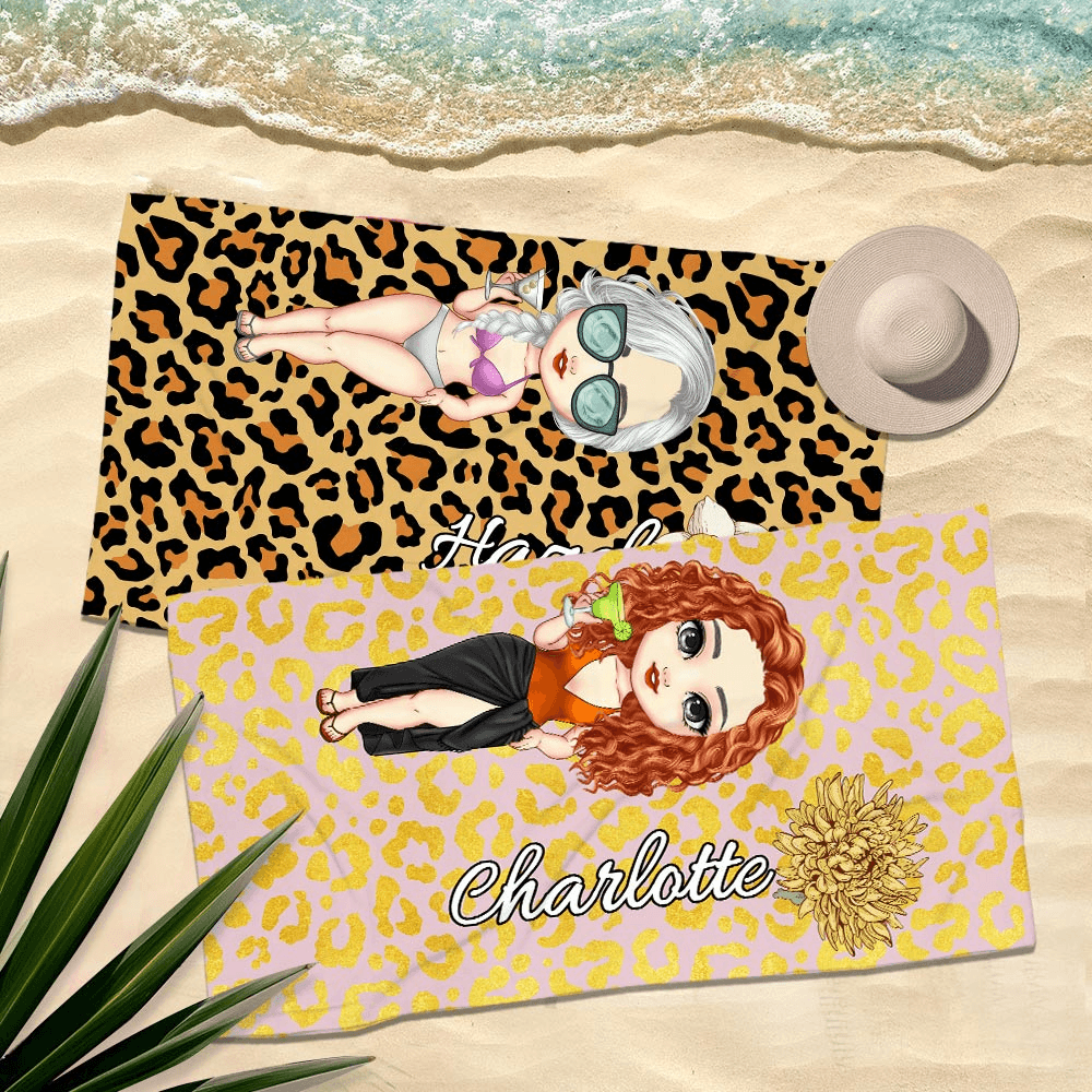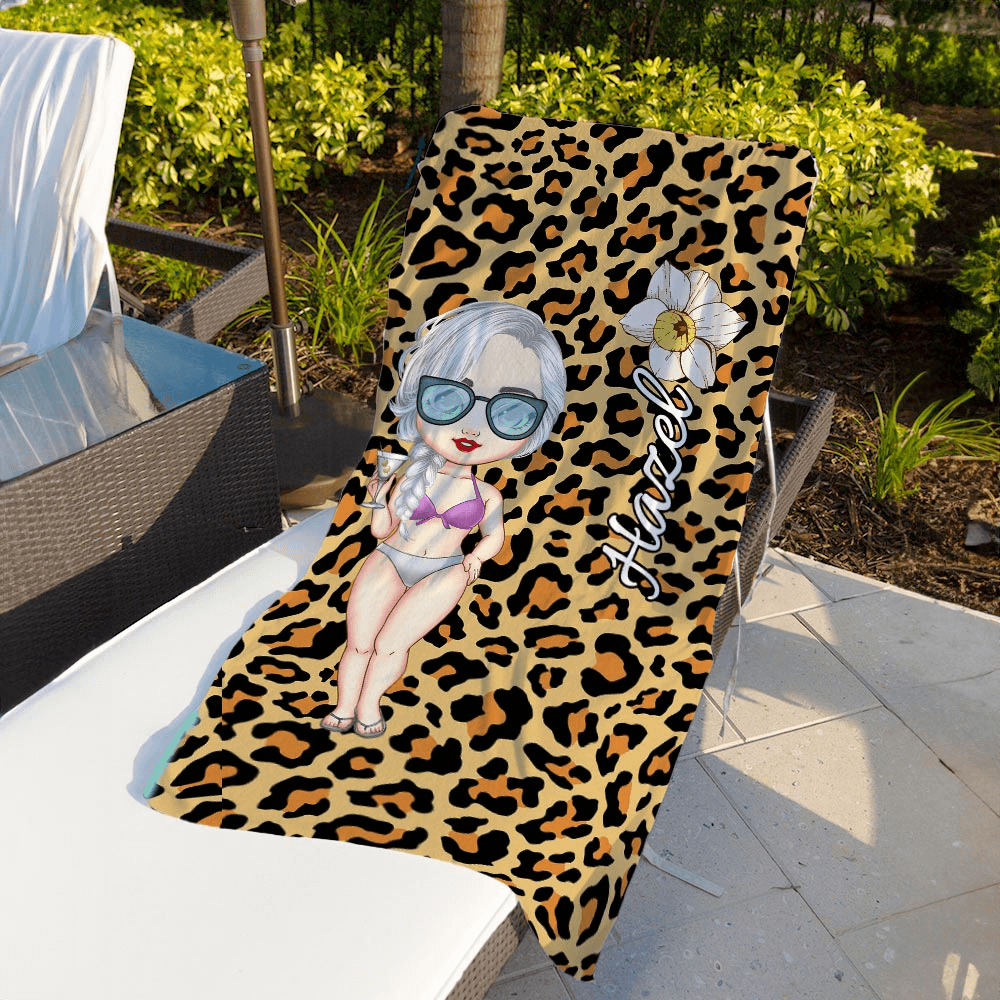Unique illustration – Create your trendy beach towel by customizing a fashionable cartoon girl paired with your birth flower, adding personal charm to every beach day.
