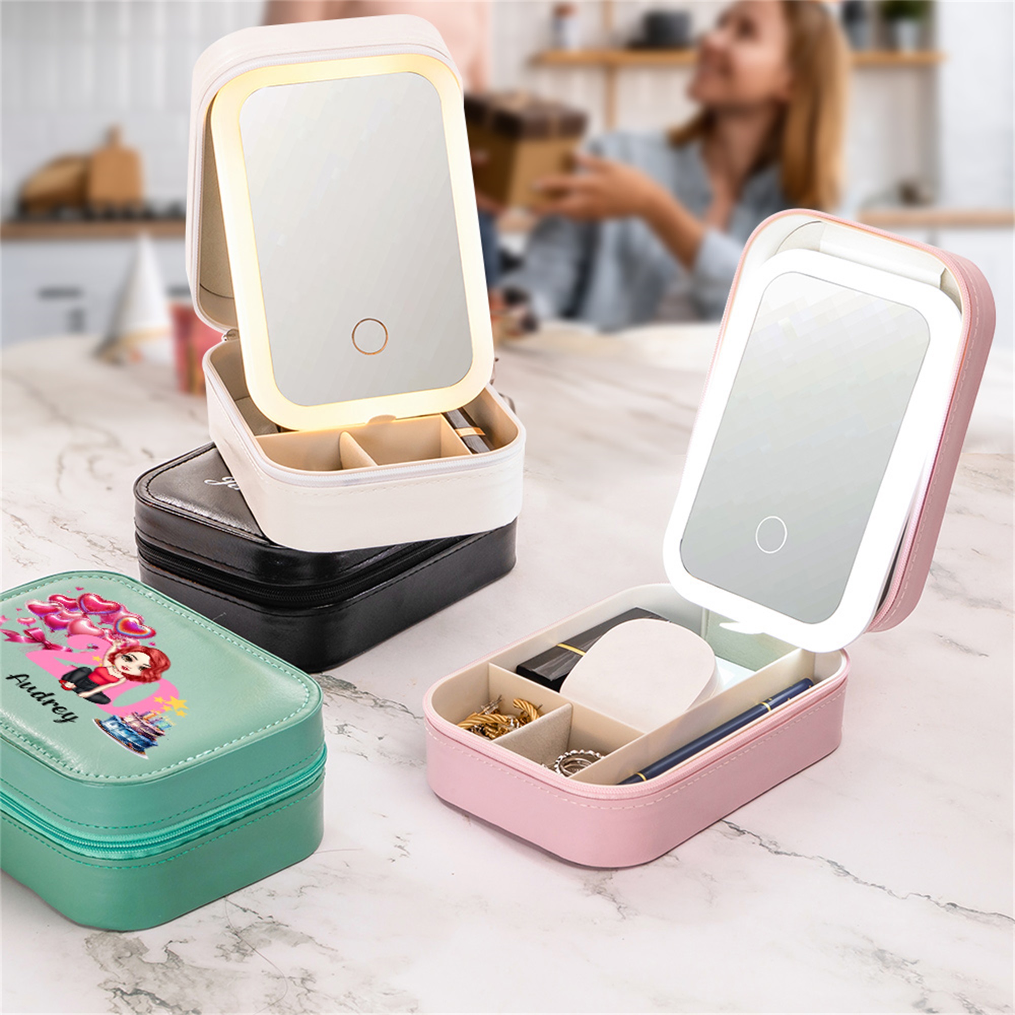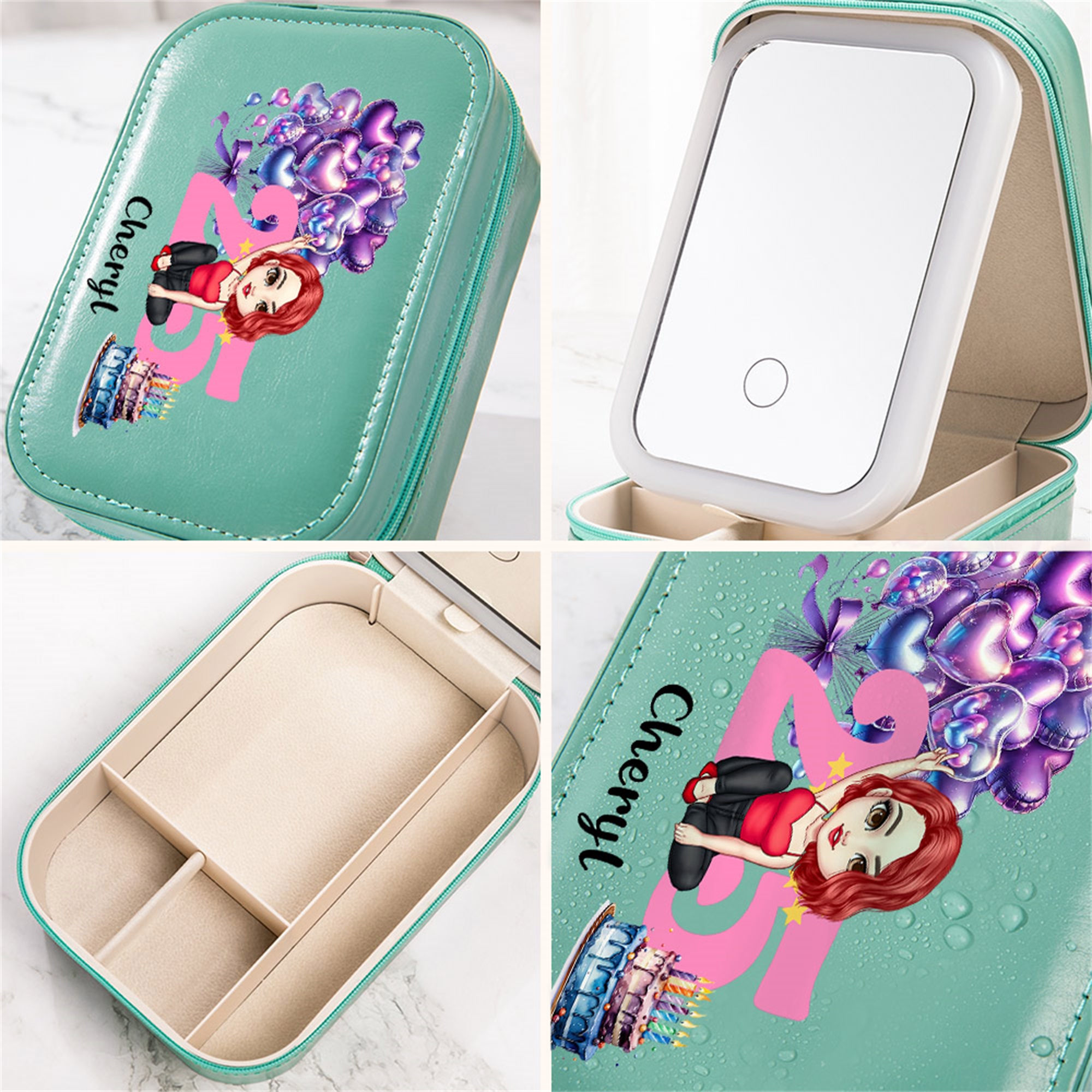 Personalized Name & Age Cartoon Woman Character Makeup Jewelry Box with Three-Color LED Light Mirror, Travel Essentials, Birthday Gift for Her